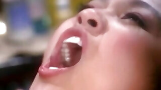 Asian beauty wraps her lips around a monstrous white cock then gets drilled