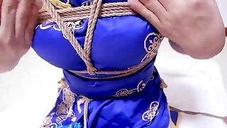 Beautiful and naked sandy-haired milf is on her knees corded up