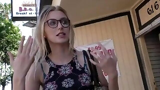 Blond PAWG with glasses shakes her booty and begs for facial cumshot